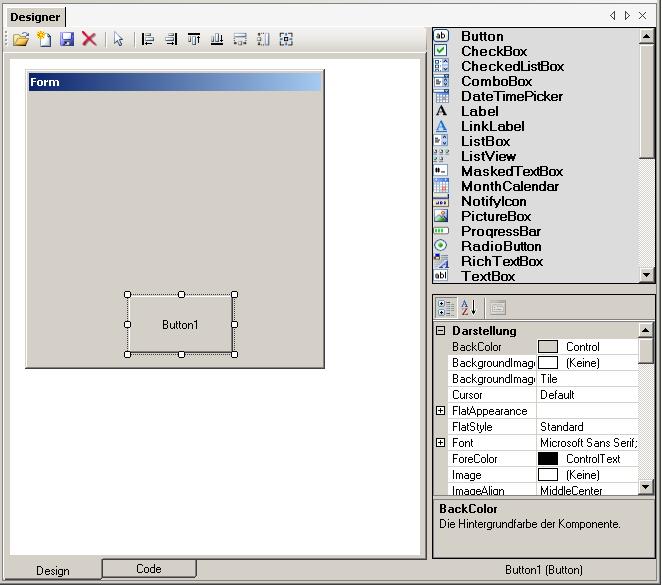 Der Designer besteht aus Toolbar, Toolbox, Properties und Arbeitsbereich. Der Arbeitsbereich unterteilt sich in die Bereiche Design und Code, die Sie über die entsprechenden Tabs erreichen können.